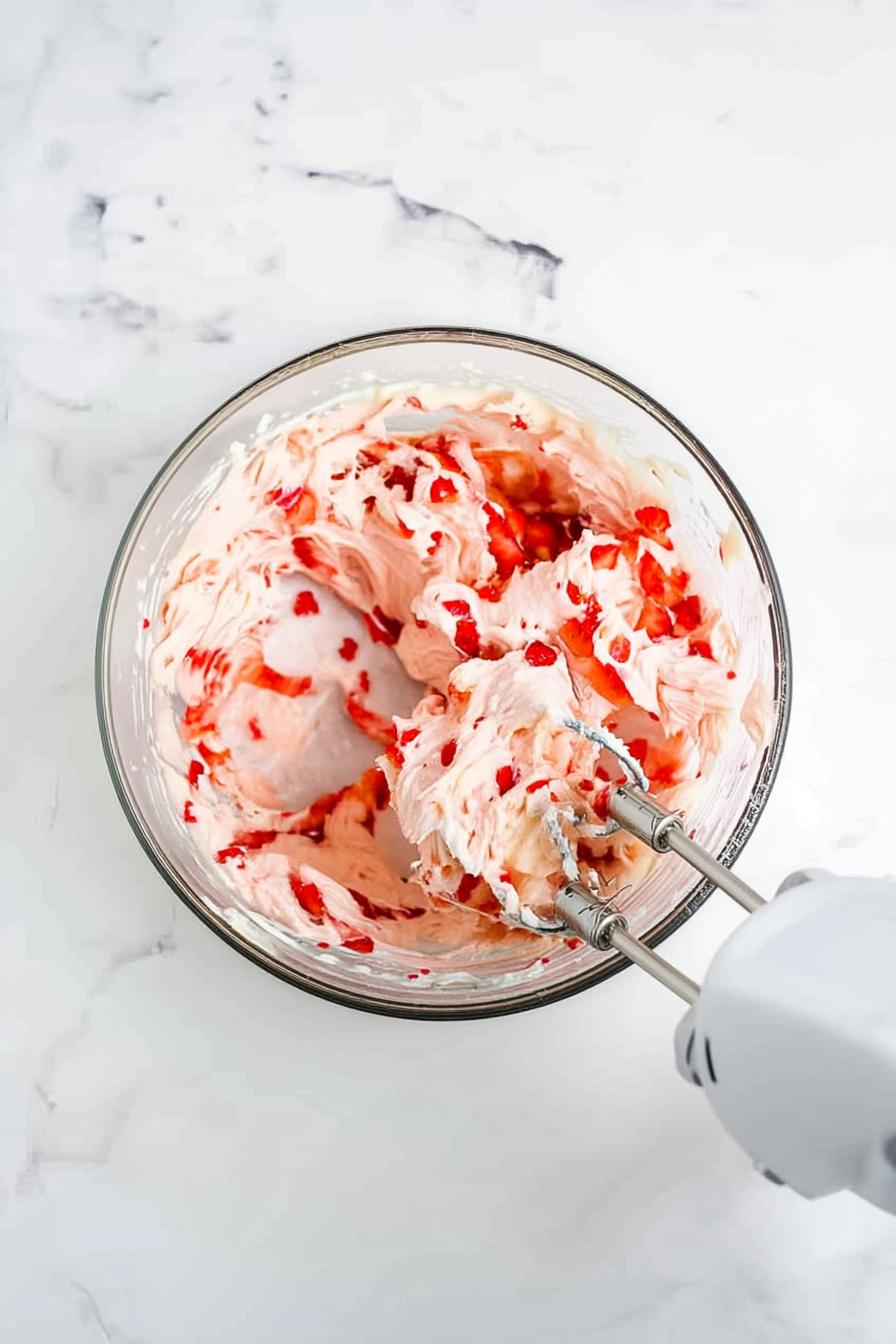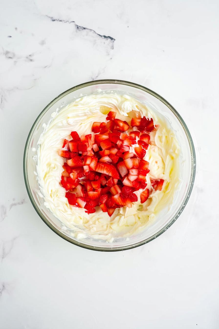 2. Gently fold in the finely diced fresh strawberries for a delightful texture—this step could vary based on desired strawberry distribution.
