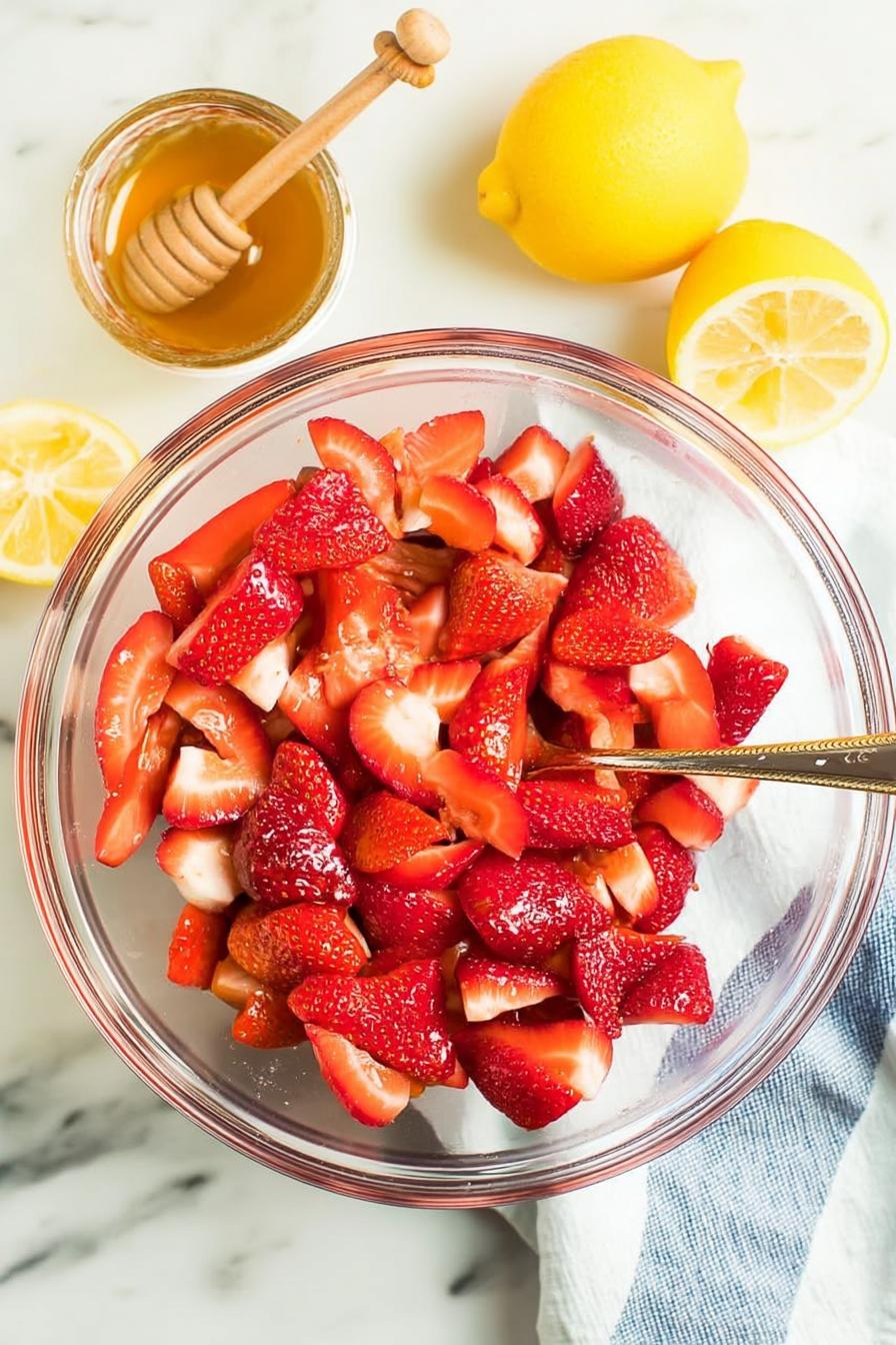 - Hull and quarter about 2 pounds of strawberries, resulting in roughly 6 cups. In a large bowl, combine them with cornstarch, honey, lemon juice, and vanilla, mixing gently to coat.