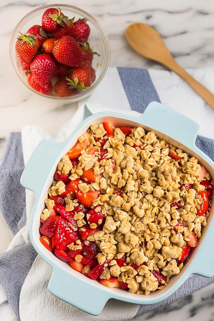 - Transfer the strawberry mixture to a 9×9-inch baking dish, ensuring you include all juices. Sprinkle the oat topping evenly over the strawberries. Bake for 40-50 minutes until the topping is golden brown and the fruit is bubbly.