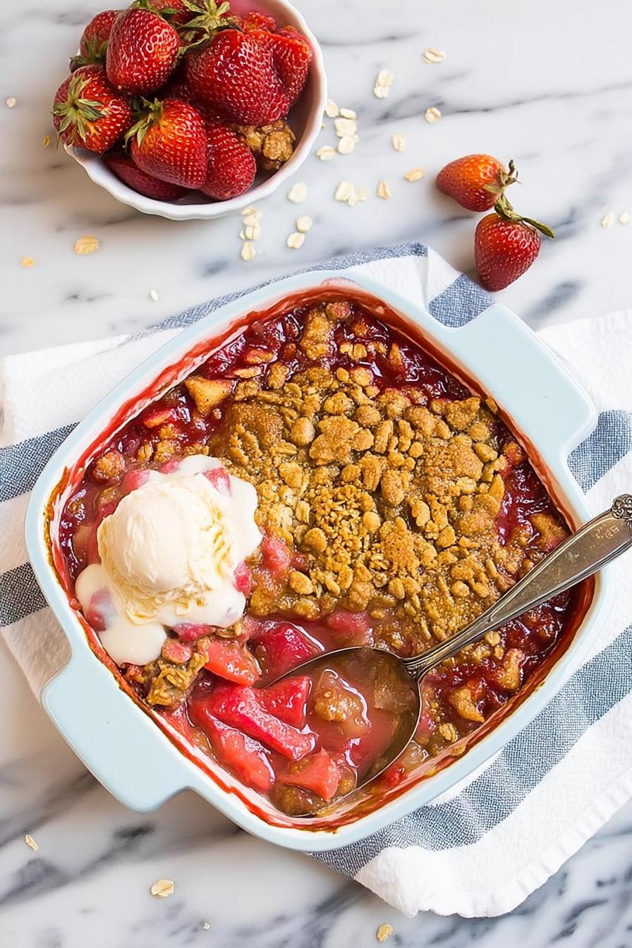 - Transfer the strawberry mixture to a 9×9-inch baking dish, ensuring you include all juices. Sprinkle the oat topping evenly over the strawberries. Bake for 40-50 minutes until the topping is golden brown and the fruit is bubbly.