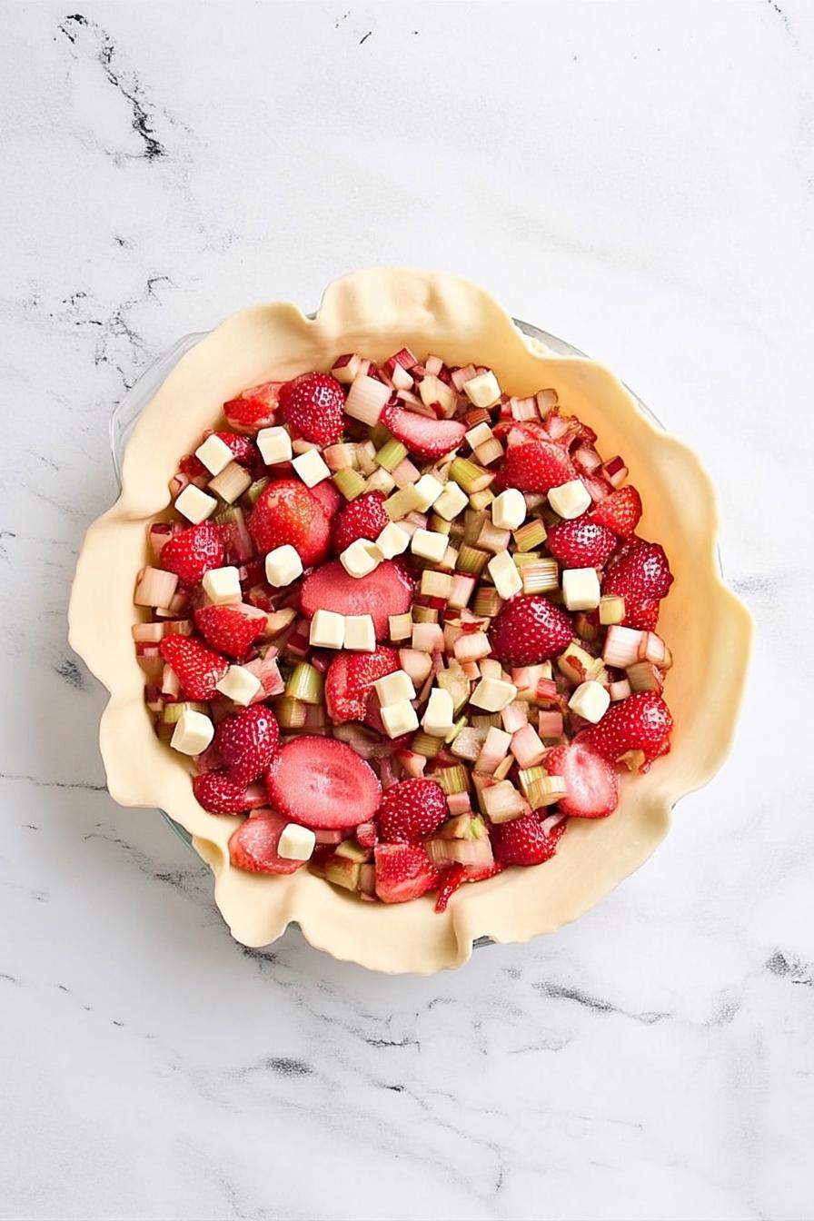 4. Pour your fruity filling into the crust and scatter small cubes of butter on top before covering with the second dough layer. Pinch and crimp the edges to seal in your deliciousness.