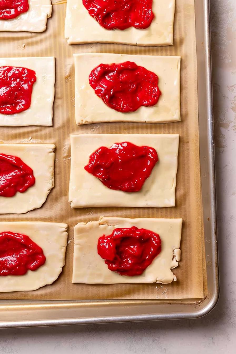 - Cut the rolled dough into rectangles, add a spoonful of strawberry rhubarb filling, and top with another rectangle. Seal edges with a fork.