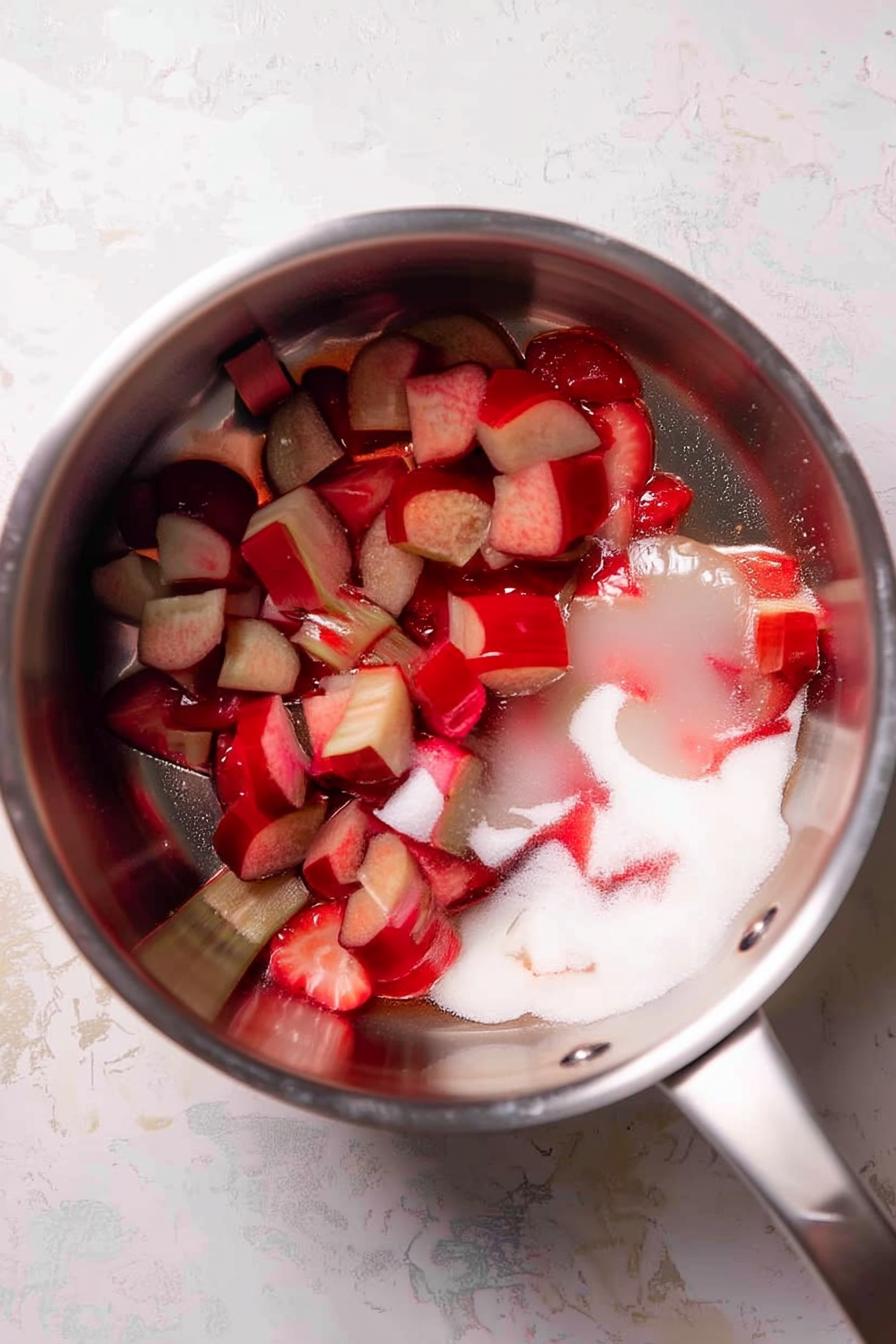 - Prepare the jam by cooking 1 ¼ cups of rhubarb and 1 cup of quartered strawberries with ¼ cup of sugar and a teaspoon of lemon juice over medium heat until thickened.