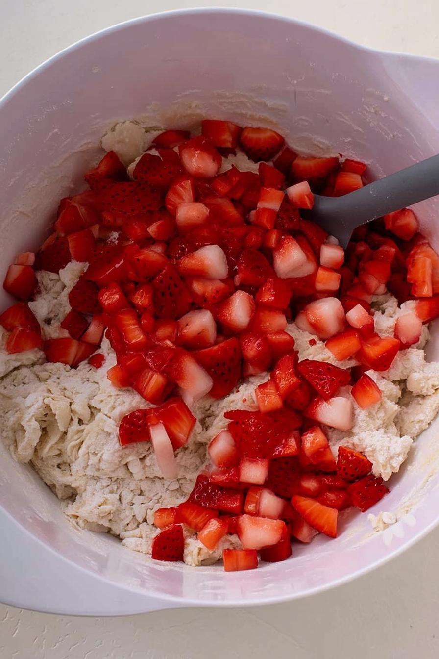 - Using a fork, stir sour cream mixture into flour mixture until large dough clumps form. Fold in the strawberries and gently press the dough into a ball.2/3 cup diced fresh strawberries