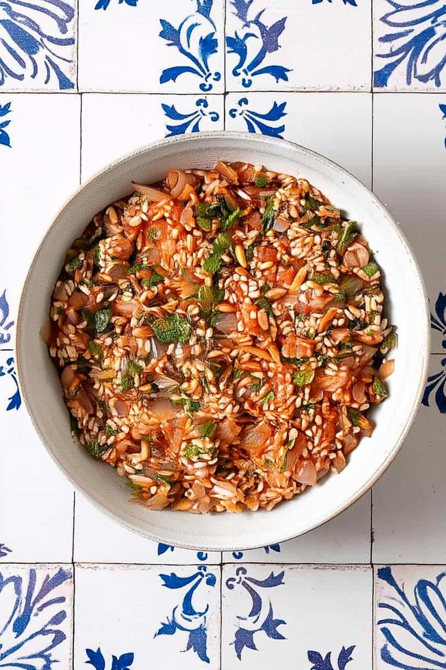- Stir in drained rice, cumin, cinnamon, chopped herbs, pine nuts, salt and pepper, along with 1/2 cup water. Mix thoroughly to marry the flavors.