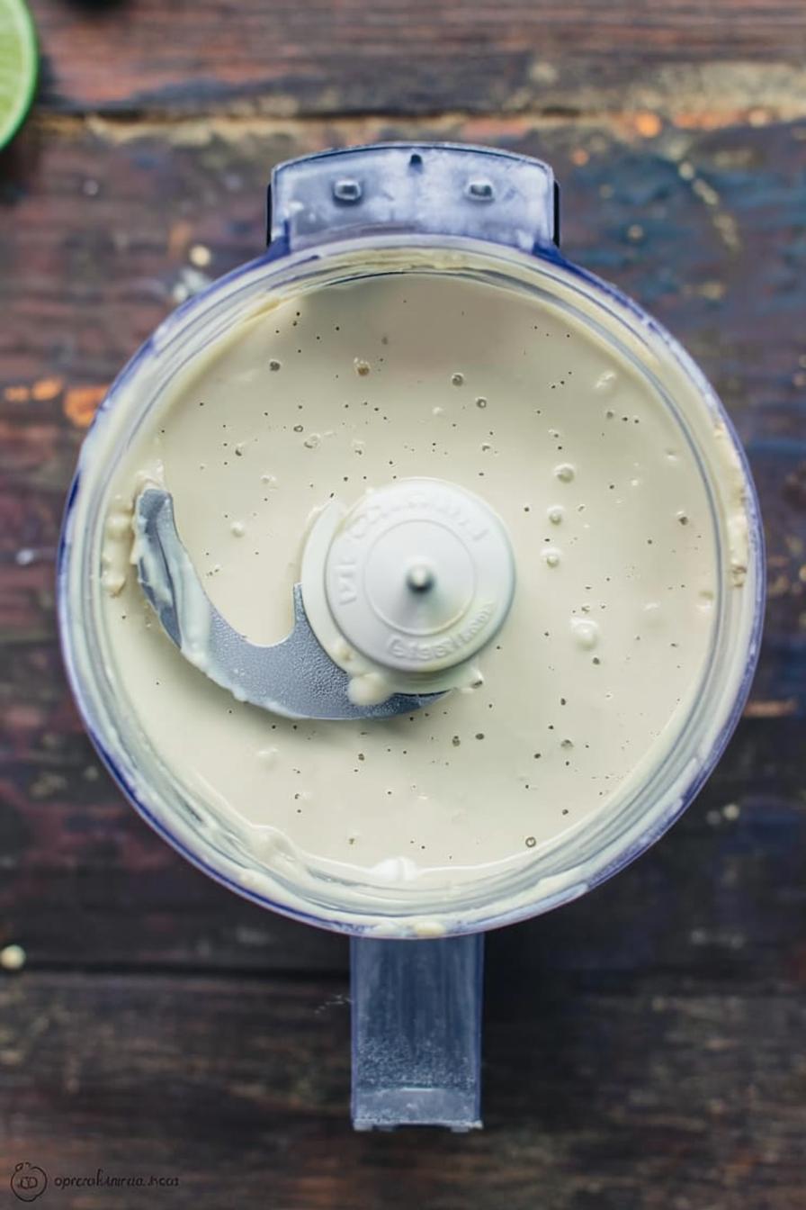 - Combine. Add the crushed garlic, tahini paste, and lime juice to the bowl of a food processor and blend (it will be thick as it emulsifies).