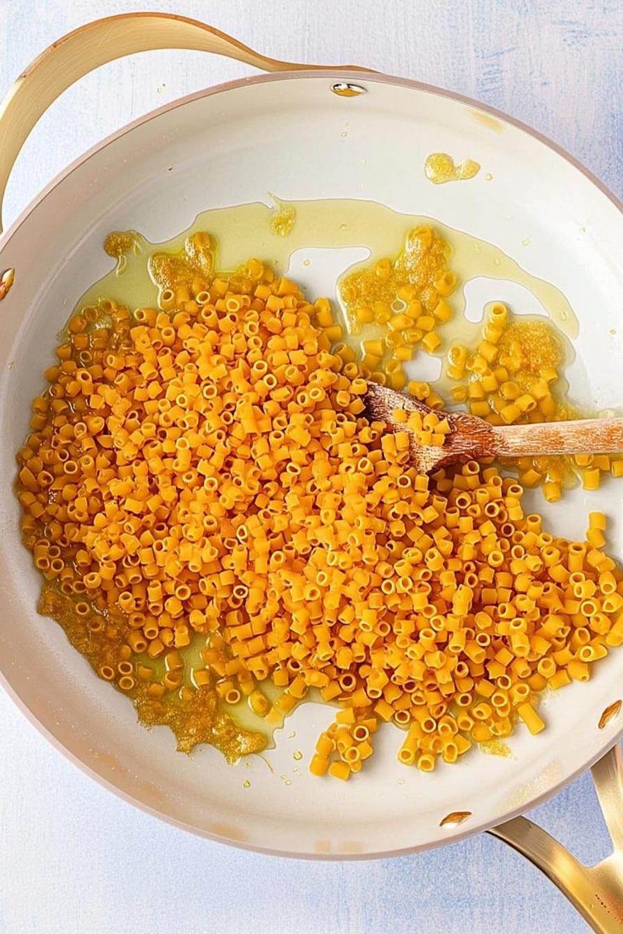 - Stir in 1¼ cups of ditalini pasta, making sure to coat it in the garlicky oil.
