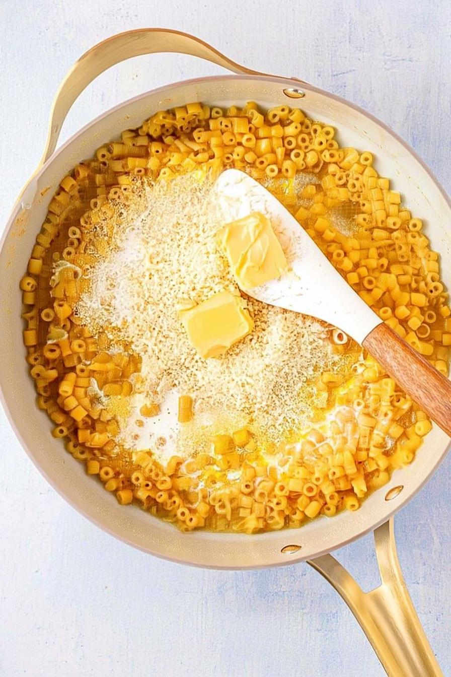 - Once the broth is mostly absorbed and the pasta is al dente—around 8 minutes—mix in ½ cup of finely grated Parmesan, ¼ cup of heavy cream, and 2 tablespoons of salted butter. Stir until melted and creamy. Adjust seasoning with salt and pepper.