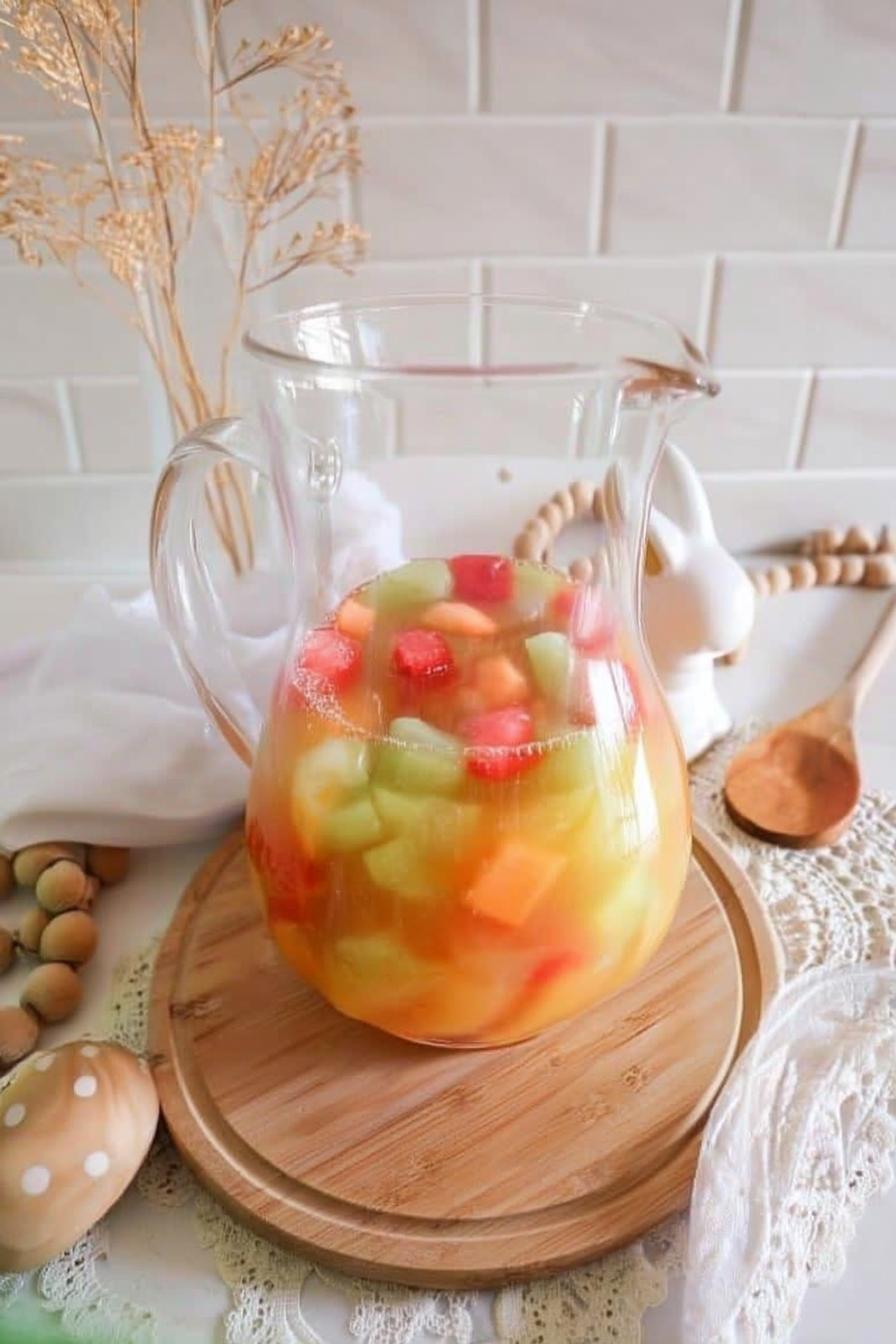 - Add the delightful rainbow of fruits into the pitcher; the colorful display is enticing enough to draw everyone in.