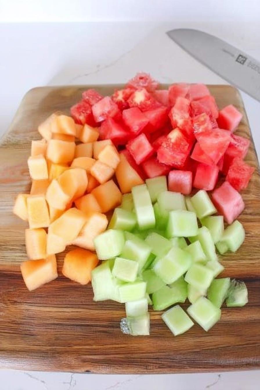 - Dice the watermelon, cantaloupe, and honeydew into small, bite-sized cubes; this not only enhances the aesthetic but also makes for easy sipping.