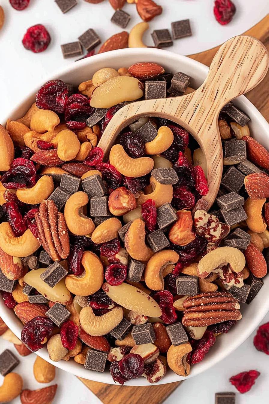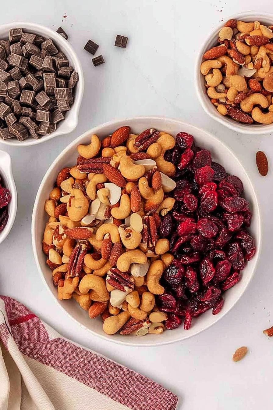 - In a large bowl, combine 32 ounces of salted mixed nuts, 1 cup of dried sweetened cranberries, and 1 cup of dark chocolate chunks. The vibrant colors make it visually appealing!