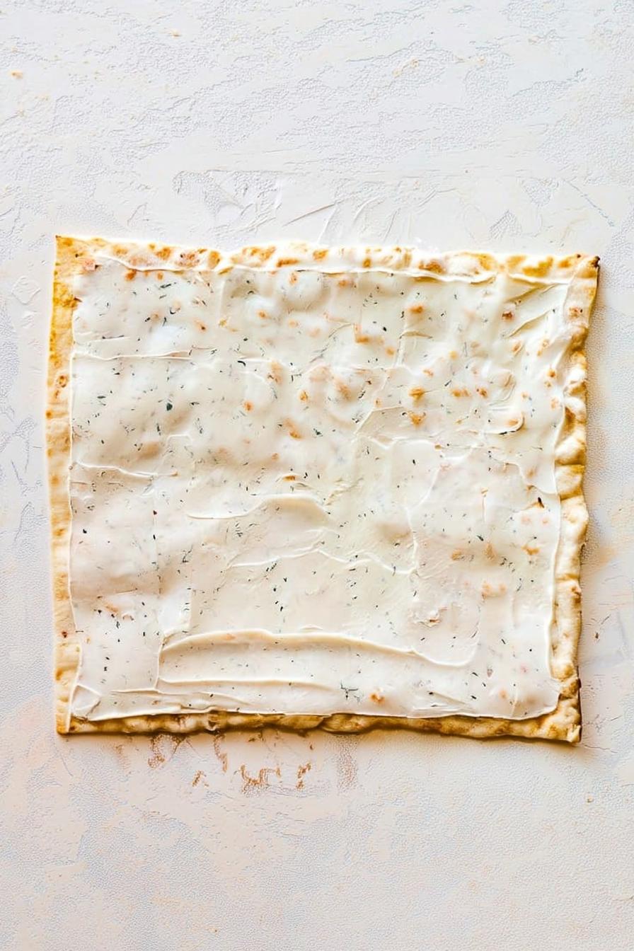 - Evenly spread a portion of the Greek yogurt ranch mixture over each lavash bread sheet, leaving a small border around the edges.