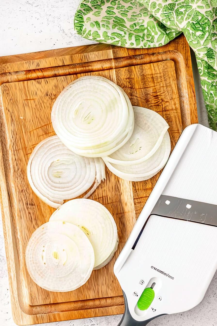 - While slicing onions, using a mandolin ensures thin, even slices for the best crunch.
