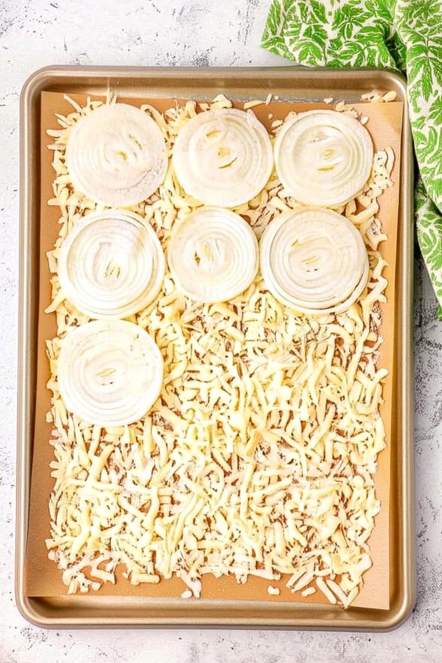 - Grate parmesan cheese and spread in a thin layer over the parchment paper. Slice onions very thin and lay them over the cheese in a single layer.